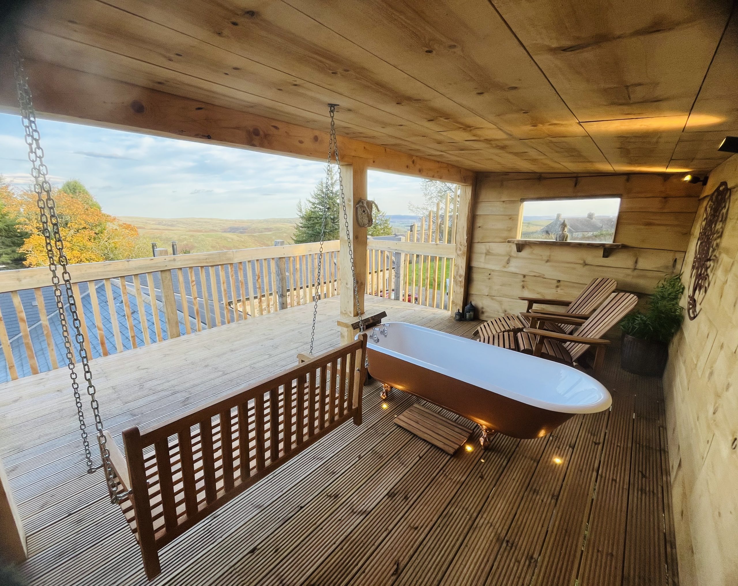 Our rooftop snug that offers a roll top bath for you to soak away your worries whilst taking in the breathtaking view of the Coquet Valley.